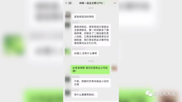 事情发生后,祝女士在小区业主群反映了自己的遭遇,业主群中一位自称暂时负责社区物业的人表示,他们已通知了维保单位做维修。