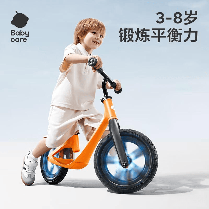 babycare儿童平衡车配备12寸发光轮胎,骑行时轮子会发出螺旋藻绿色的光芒,既增加了骑行的趣味性,也提升了安全性。轮胎采用PU实心材质,具有防爆和耐磨的特性,适合多种路面,顺滑轴承设计使得骑行更加省力。车把支持360°自由转向,操控灵活,转弯时更便利,减少意外碰撞风险。